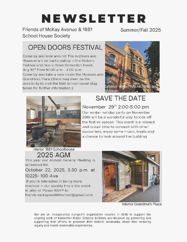- To encourage and promote an awareness of historic McKay Avenue School and the 1881 Schoolhouse as historically, architecturally, politically, and pedagogically important influences in Edmonton and the Province of Alberta.